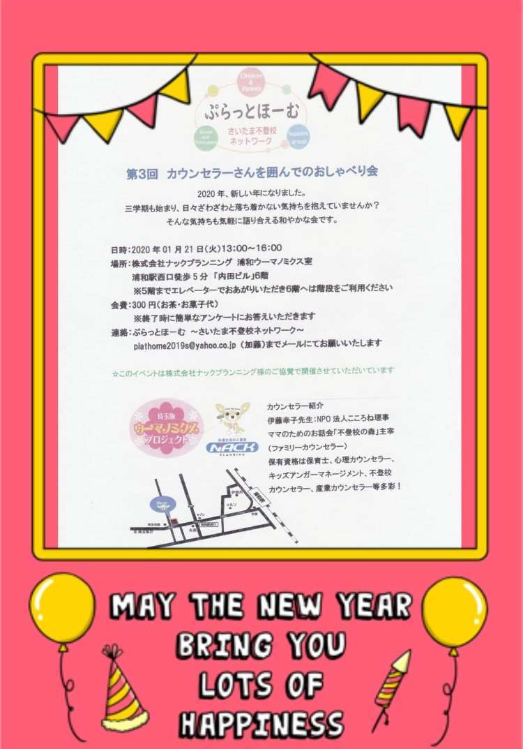 浦和ウーマノミクス室にて、「ぷらっとほ~む(さいたま不登校ネットワーク)」の「第3回 カウンセラーさんを囲んでのおしゃべり会」が開催されます。