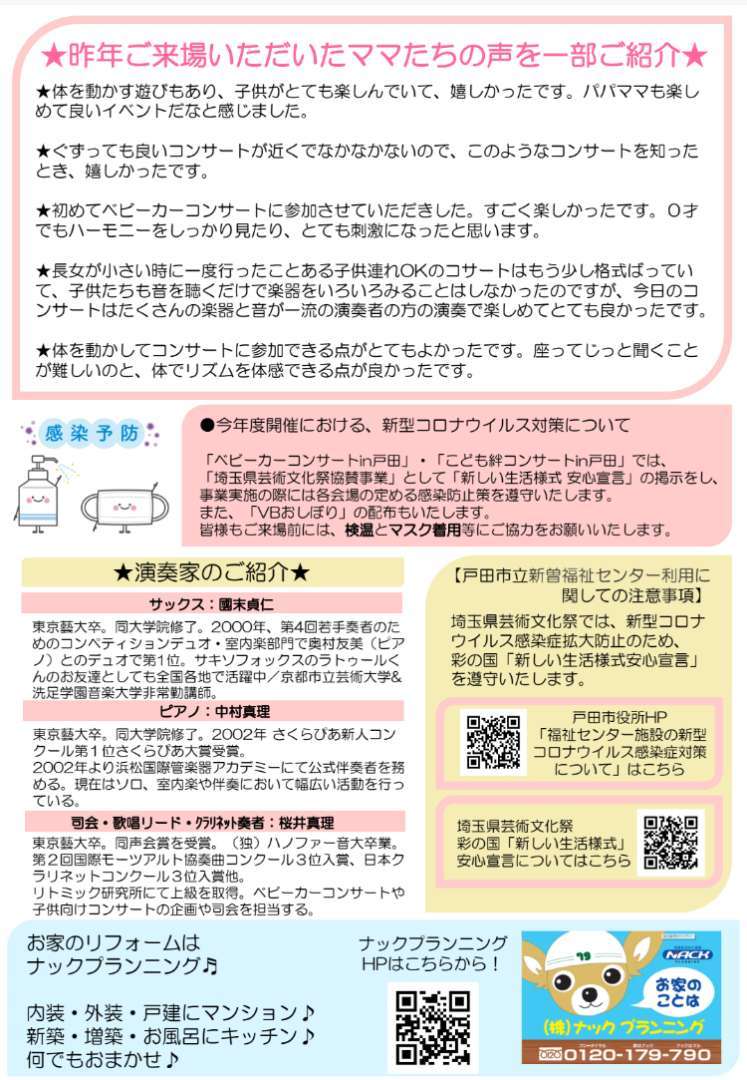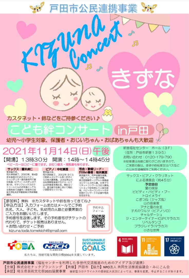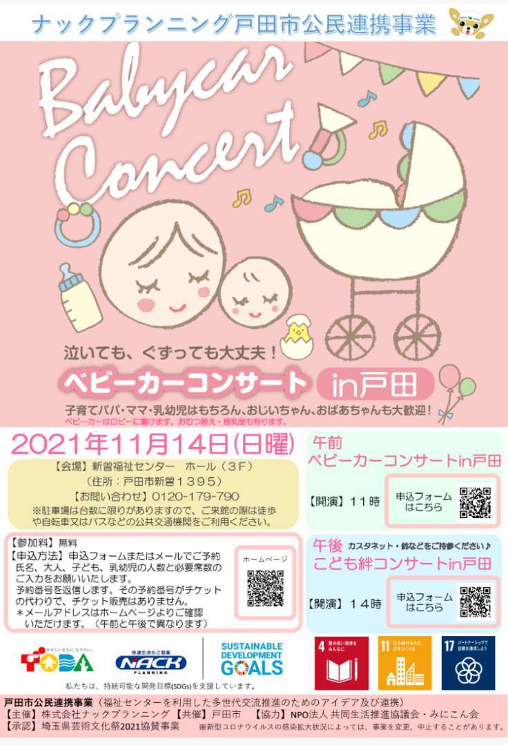 2020年秋に開催した「ベビーカーコンサートin戸田」・「こども絆コンサートin戸田」が、今年も「戸田市公民連携事業(福祉センターを利用した多世代交流推進のためのアイデア及び連携)」として、午前と午後で開催されます。さらに、今年は埼玉150周年記念イベントとしても実施!