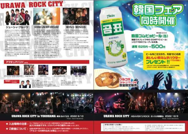 2022年 9月10日(土)には、横浜BAYSISで【浦和ロックシティ in 横浜】木暮shake武彦、高橋まこと、WING WINGSが出演。