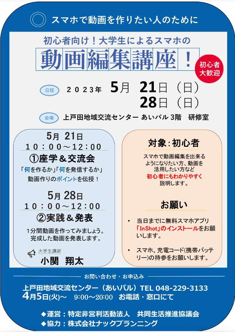 ナックプランニングのYouTube「とめきちチャンねる」で、「戸田市上戸田地域交流センター あいパル」の団体会員さんの活動紹介動画作成をお手伝いしたことがご縁で、昨年度から開催しています。