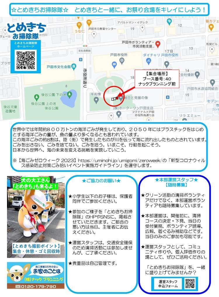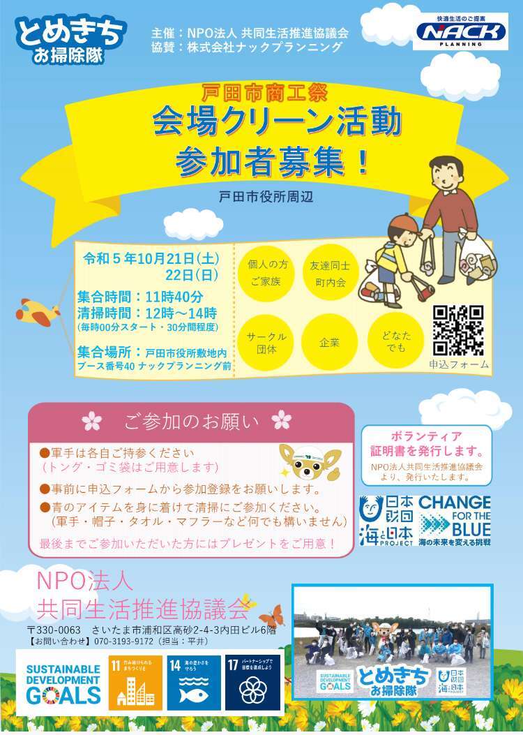 10/21土曜「戸田市商工祭」の会場を綺麗に保ち来場者を迎えるため「とめきちお掃除隊」が清掃ボランティアに参加します!どちらか1日で大丈夫!とめきちと一緒に、お祭り会場をキレイにしませんか?
