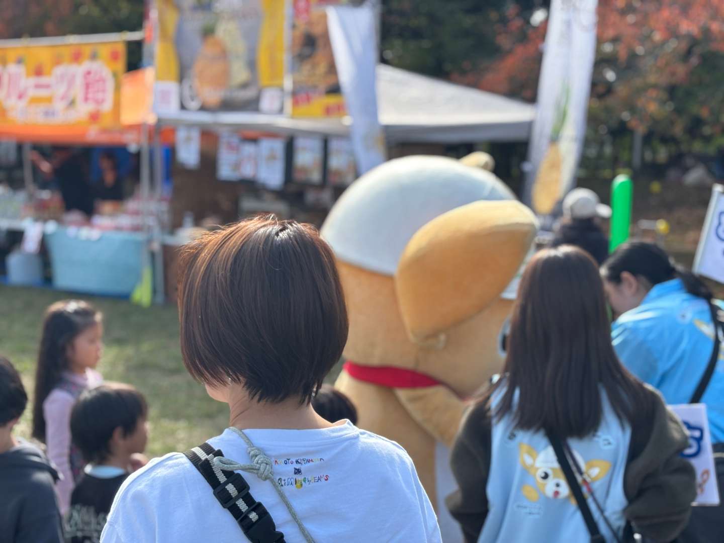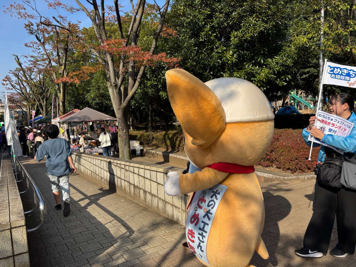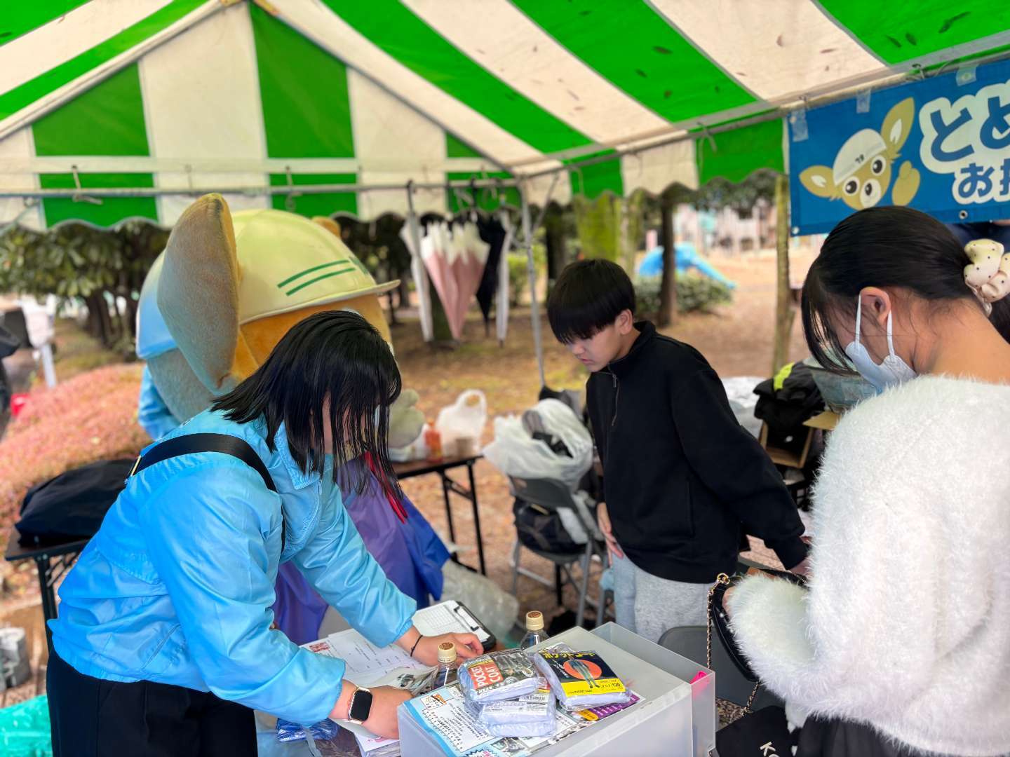 とめきちは一緒に掃除をすることができなかったので、ブースのテントでお客様と交流をしていました。