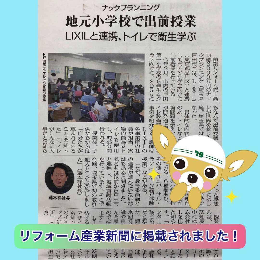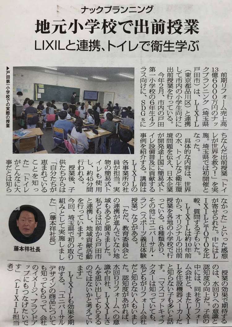 ナックプランニングがLIXIL様と連携して取り組んでいる「小学生向け出前授業」について、「リフォーム産業新聞 1554号(2023/05/29発行)2面」に掲載されました。