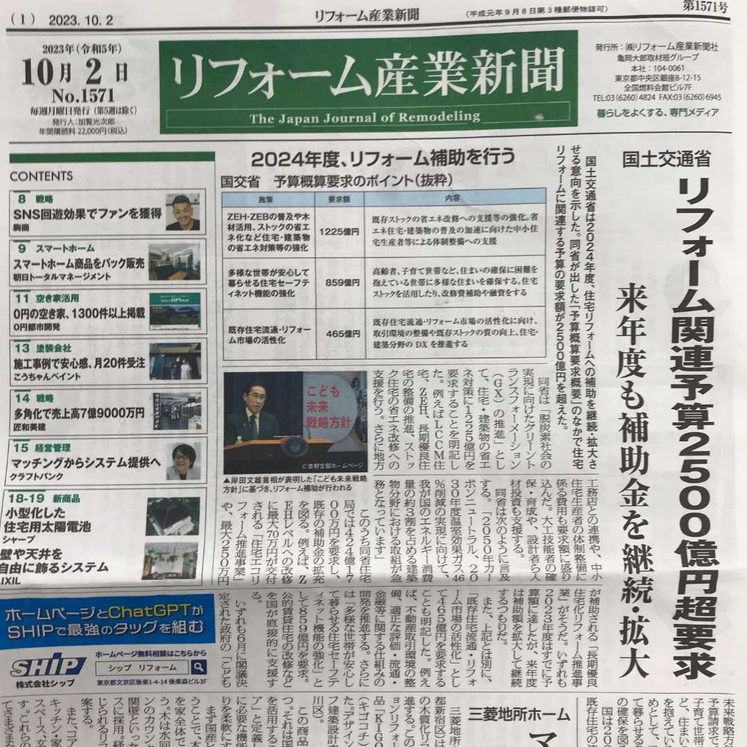 リフォーム産業新聞様、掲載ありがとうございました。