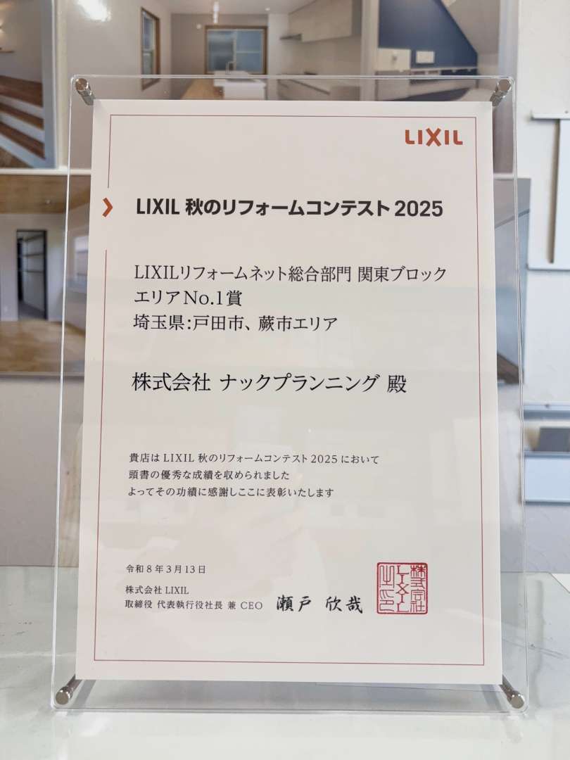 LIXILリフォームネット総合部門関東ブロック エリアNo.1賞を受賞いたしました。