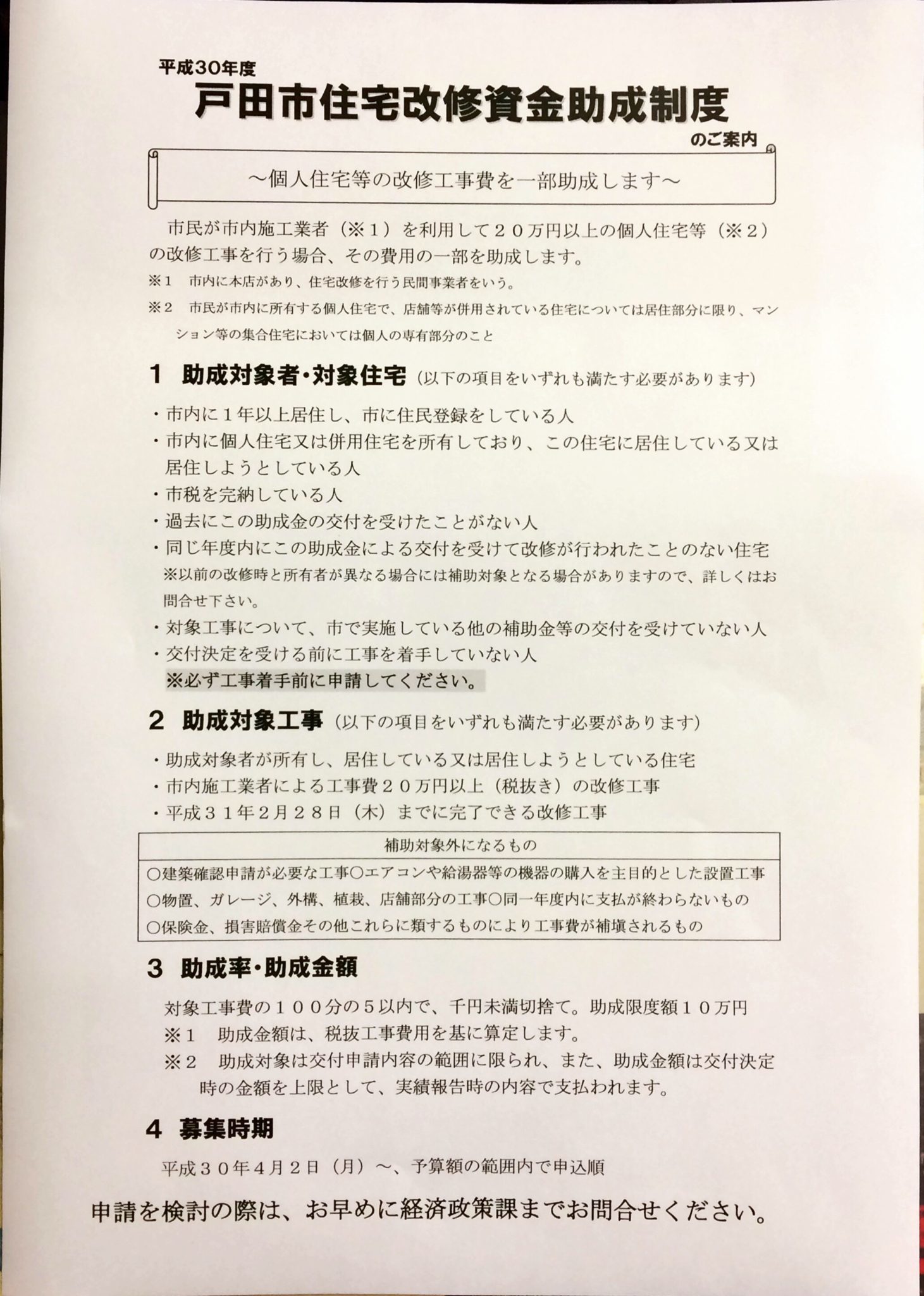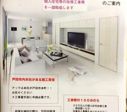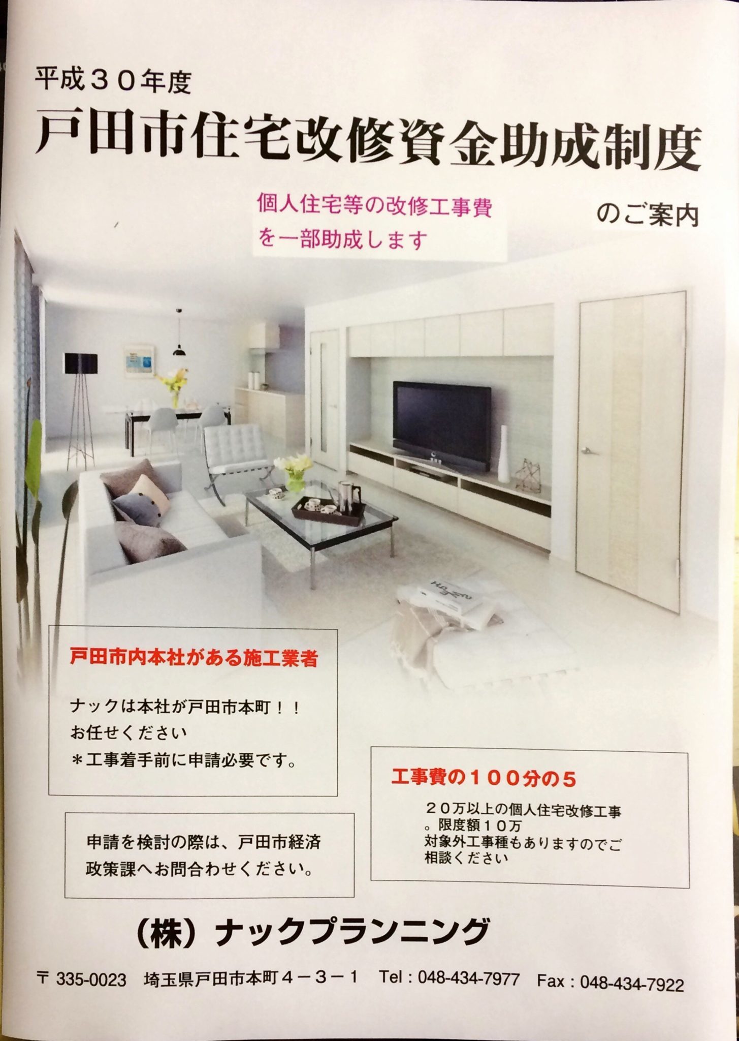 戸田市では素敵な助成制度があります。 個人住宅等の改修工事を一部助成します。 本社が戸田市という条件もありますので、市内優秀な会社が多くありますが、ナックを選んでいただけたら嬉しいな。 詳しくは戸田市役所 経済政策課 へお問い合わせください。 4月2日から始まっていますので、予算枠があるうちにご検討をおすすめします!