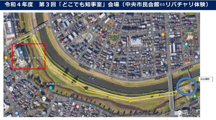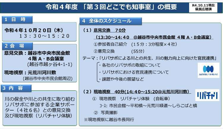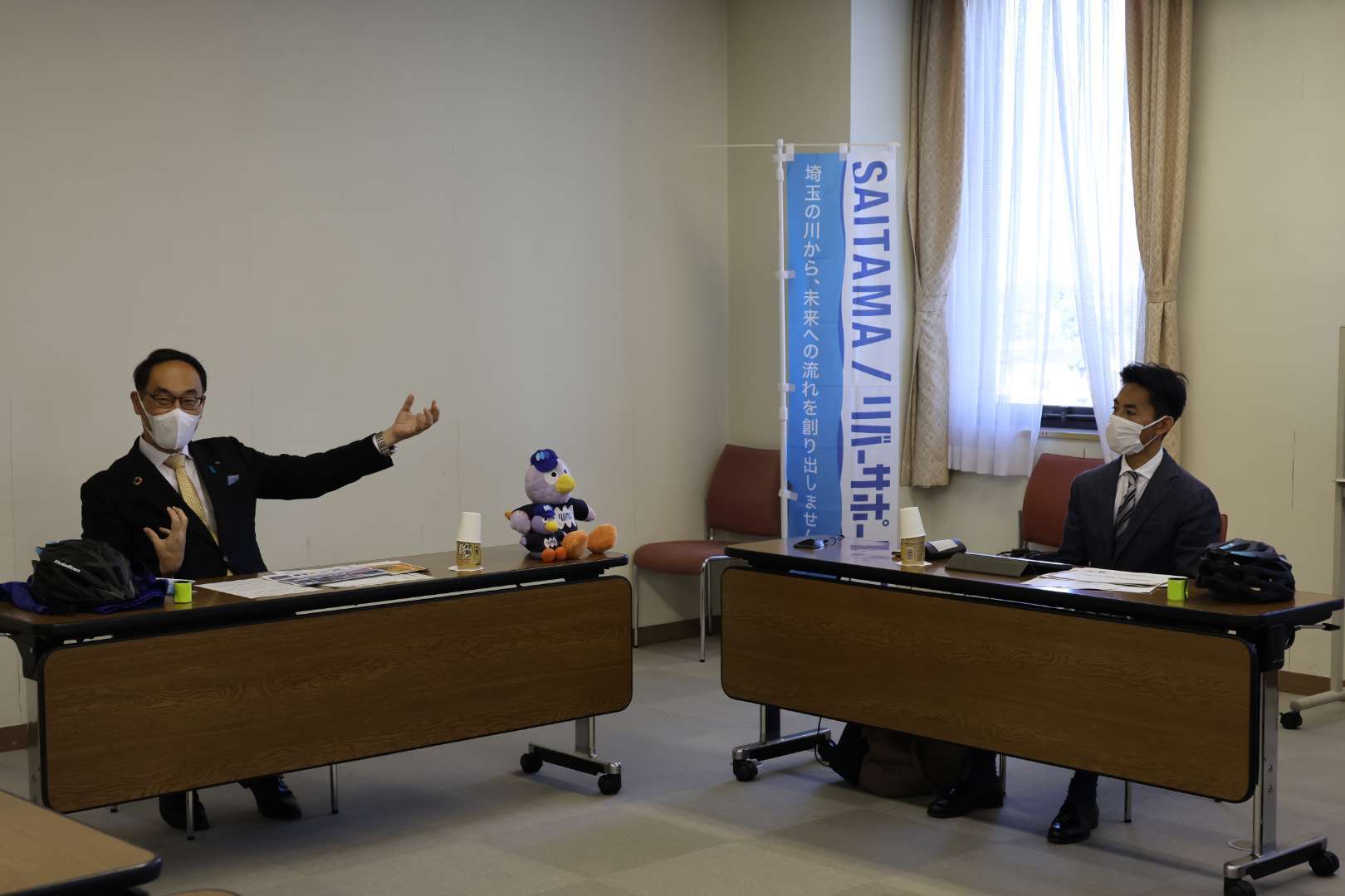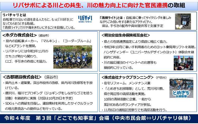 10/20(木曜)に、越谷市の中央市民会館で、埼玉県が取り組む「リバサポ(※1)」 について、「リバサポによる川との共生、川の魅力向上に向けた官民連携」をテーマに、埼玉県の大野県知事と意見交換及び、元荒川河川敷で「リバチャリ(※2)」体験をする、4社のうちの1社として、ナックプランニングが参加しました。