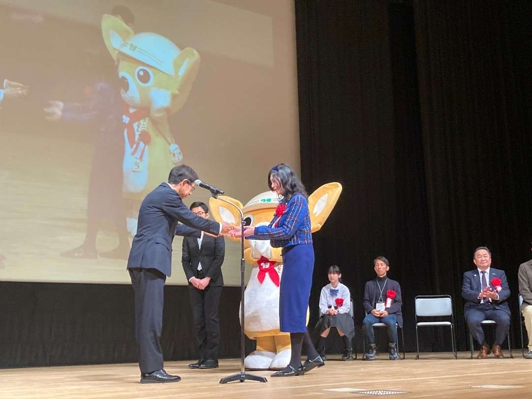 授賞式では、とめきちと担当者が壇上に上がり、記念の盾をいただきました。