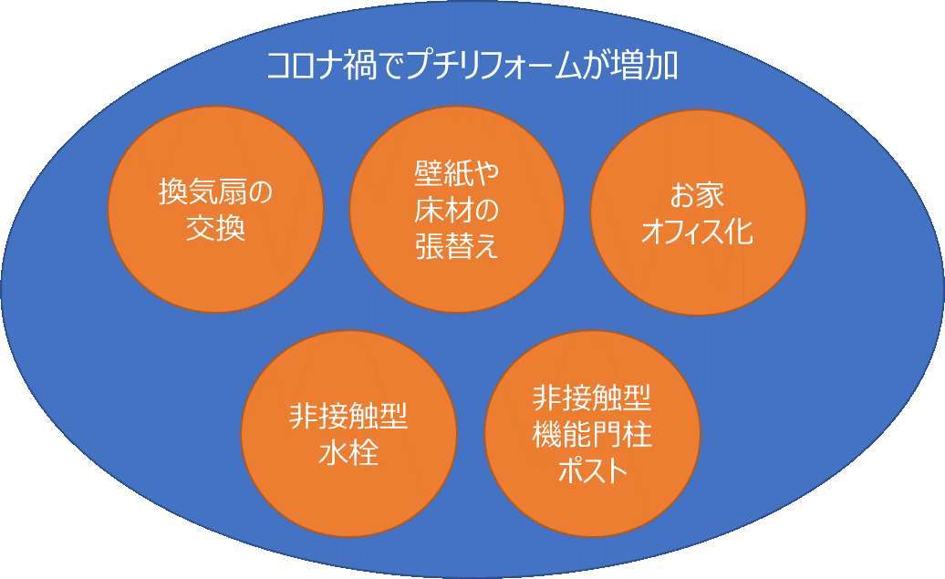 新型コロナウイルスの影響により、自宅で過ごす時間が多くなった現在、自宅をリフォームする方が増えています。「おうち時間」を快適にするためのリフォームはもちろん、感染対策としての換気機能強化やリモートワーク用のスペースの設置など、その内容は多彩です。今回は、コロナ禍で人気となっているプチリフォームをご紹介します。