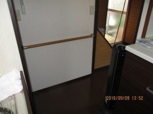 段差の大きなトイレの入り口。 小さな段差も大きなケガにつながります。 廊下からトイレまで タオル掛けのバーが