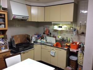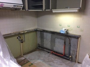 先ずは解体! 給湯給排水管やガス管。 食洗器用のコンセントなどを移設します。