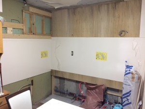 目地の汚れ掃除が大変なタイルはやめて さっとひと拭きのキッチンパネルを施工します。 吊戸棚大きさを工夫しましたので、 的確な位置に下地も補強します。