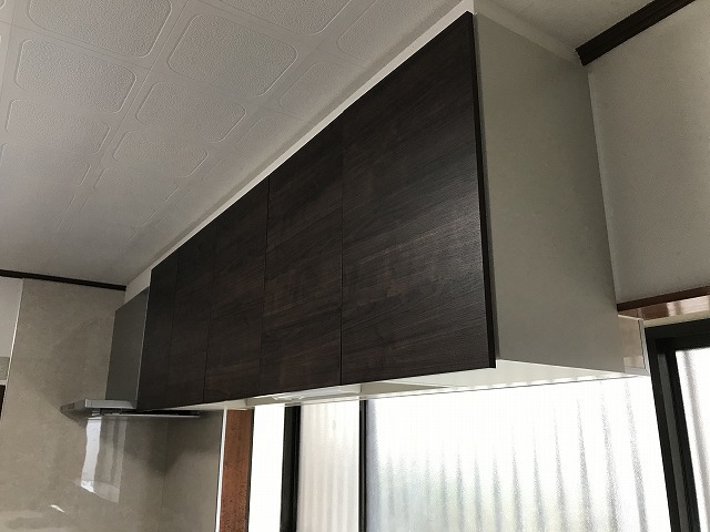 吊り戸の扉も以前のサイズより 大きく収納up[/caption] タイルの部分は シックな鮮やかな ベージュ柄のパネルにしました。