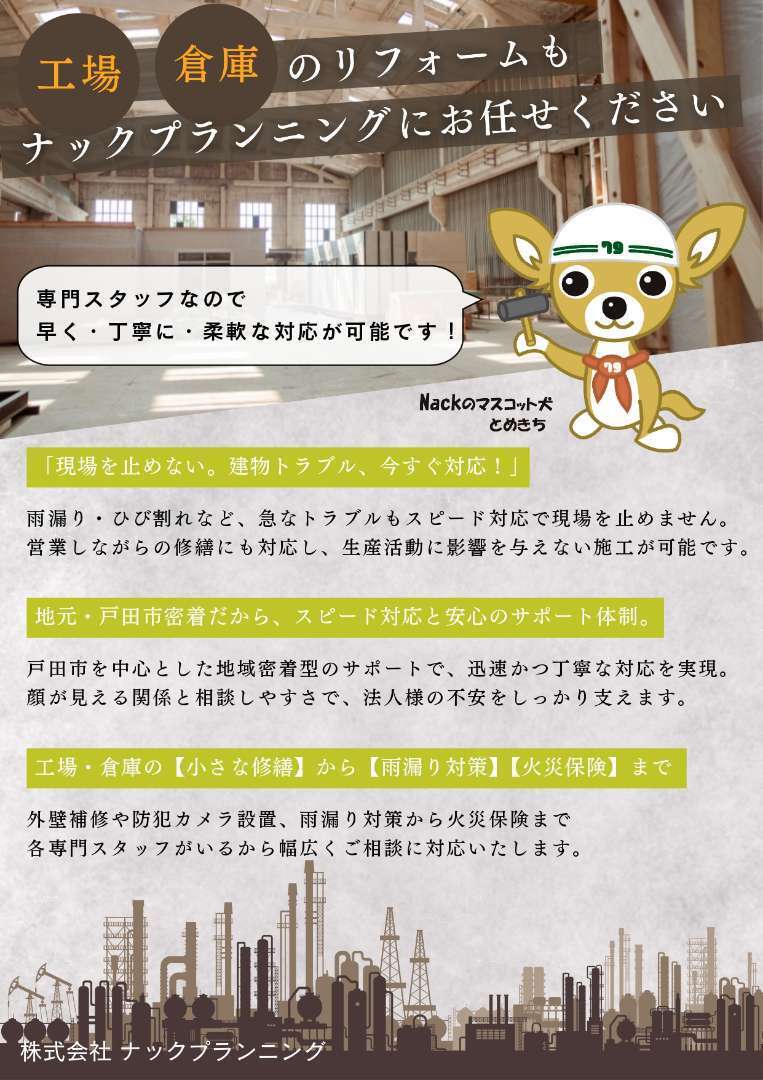 ナックプランニングでは、工場・倉庫のリフォームや修繕にも対応しています。