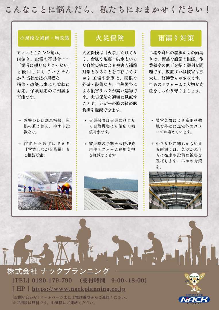 など、建物に関するさまざまなお悩みに対応しています。