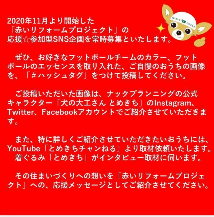 ご投稿いただいた画像は、ナックプランニングの公式キャラクター「犬の大工さん とめきち」の各種SNSアカウント( 下記記載 )でご紹介させていただきます。