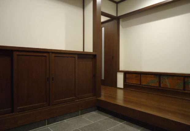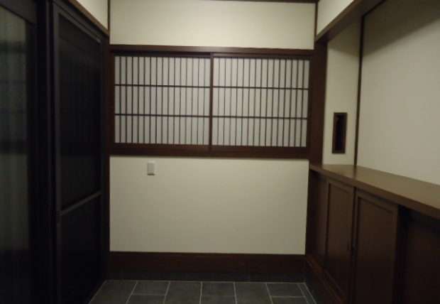 今回、玄関の改修工事にあたり、その「笹の葉に止まるスズメ」の絵がある戸棚が置き棚として再登場しました。さらに障子も、小さくして再登場です。