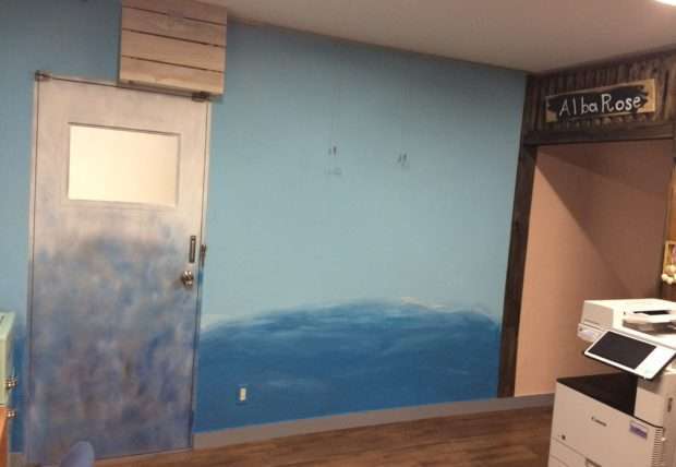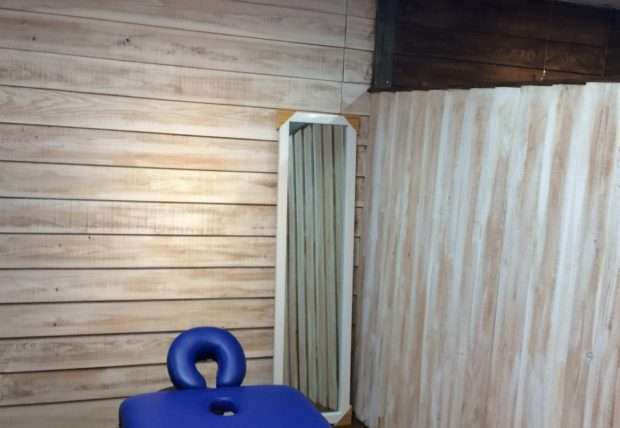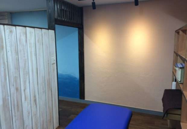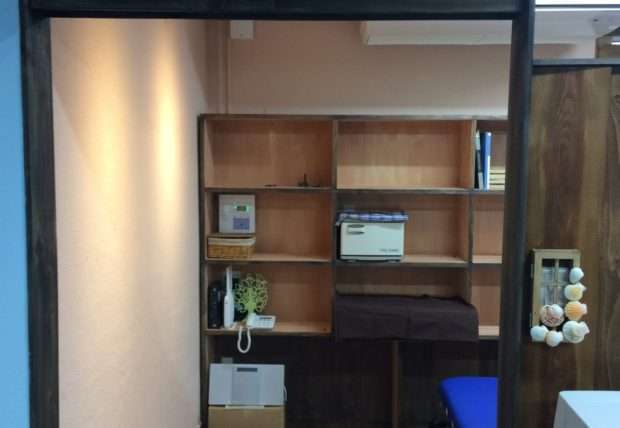 癒しといえば木との意見が多く。壁を杉板メインで仕上、カウンターも手作りです。健康サロン併設で3坪スペースは女性らしい白をメインに、癒しのテコールピンクを混ぜながらカラーコーディネート。